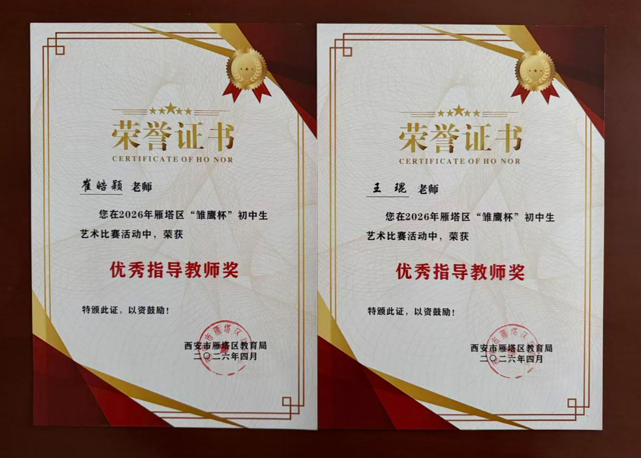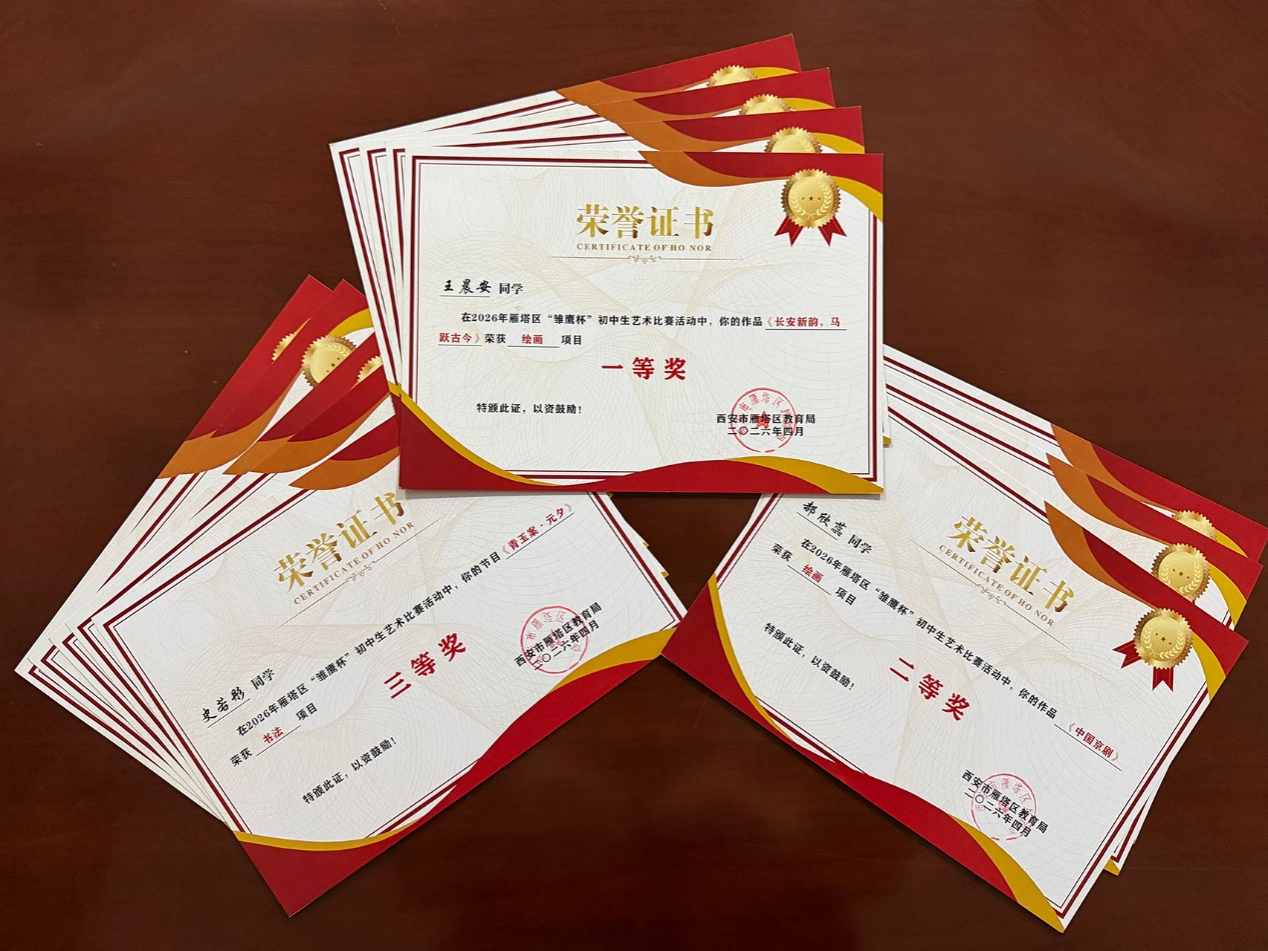 由西安市雁塔区教育局主办的 2026 年雁塔区 “雏鹰杯” 初中生艺术比赛已圆满落下帷幕。西安科技大学附属中学学子实力尽显,凭借扎实的艺术修养、新颖的创作构思和朝气蓬勃的精神面貌,在全区多所学校的参赛选手中脱颖而出。本次赛事涵盖声乐、舞蹈、朗诵、器乐、绘画、书法六大类别,我校学子奋勇角逐,最终收获8 项一等奖、8项二等奖、11项三等奖。我校王琨、崔皓颖两位艺术教师获评 “优秀指导教师”。这份亮眼的成绩单,直观展现出我校美育工作高质量发展的丰硕成效。