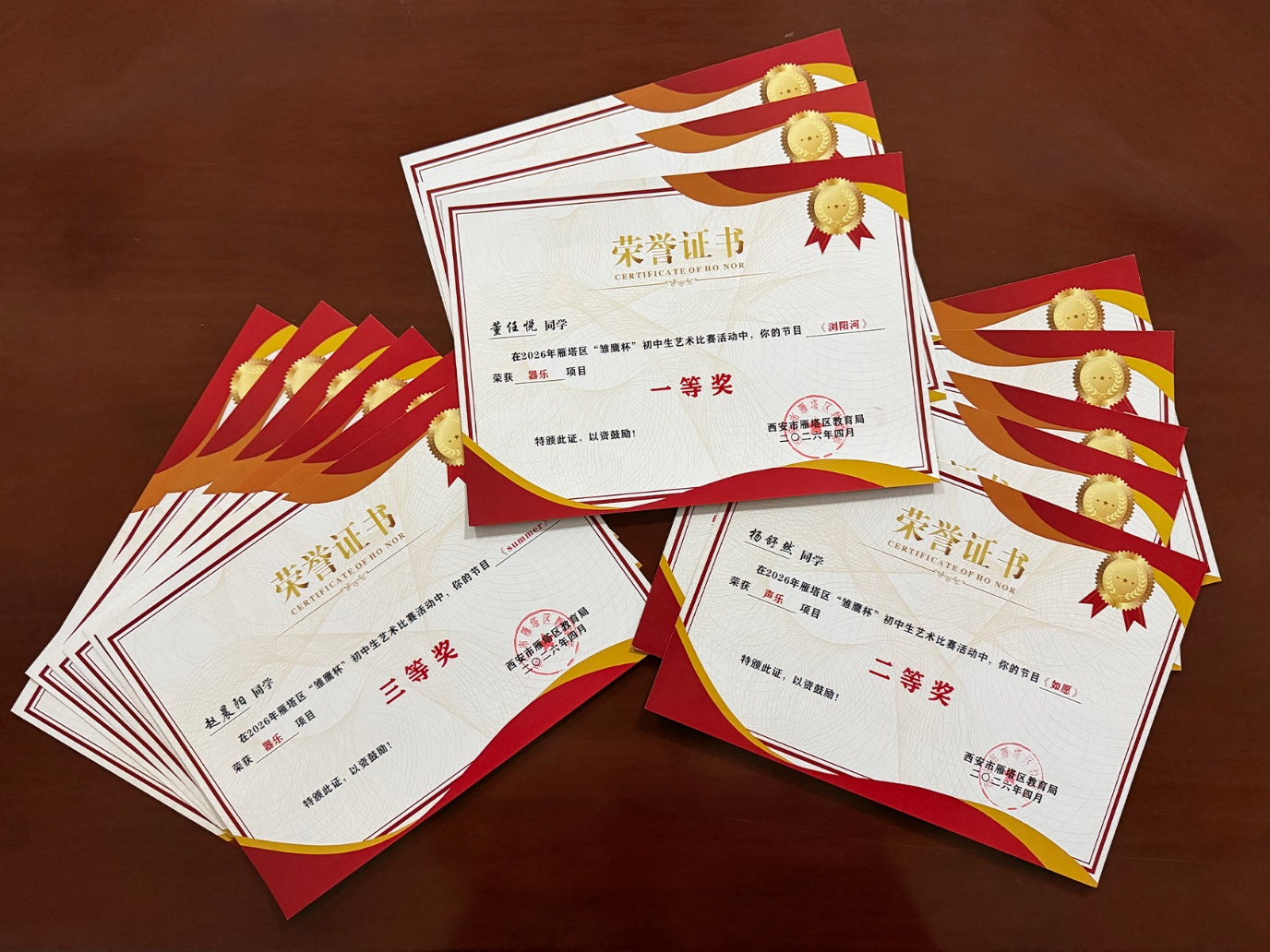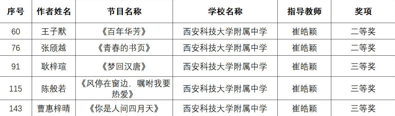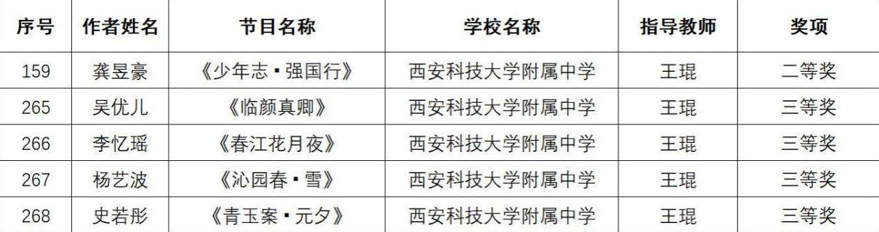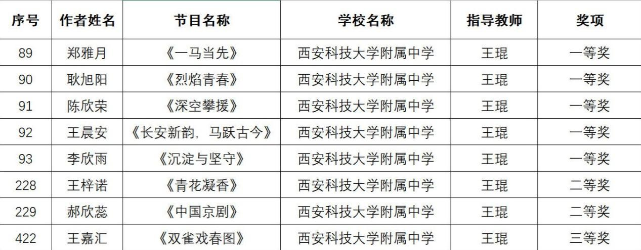 在这里,我们要向所有获奖的同学表示最热烈的祝贺!这份荣誉,是你们日复一日的练习与坚持换来的,是你们艺术才华的最好证明,更是你们青春奋斗的生动印记。还要特别感谢各位辛勤付出的指导老师,是你们的悉心教导、耐心打磨,才有了选手们赛场之上的精彩表现;感谢西安市雁塔区教育局的精心策划与组织,为全区初中生搭建了这个交流学习、展示自我的平台,让美育之花在校园绽放。